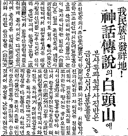 1920년대부터 신문에 연재되었던 백두산 기행문은 단군을 근대 신화로 자리잡게 하는데 큰 몫을 하였다. 1921년 8월 6일부터 8월 20일까지 함경남도 도청에서 조직한 백두산 탐험대가 등정을 하였는데, 이와 관련하여 《동아일보》에 ‘아민족(我民族)의 발상지! 신화전설의 백두산에’라는 기사가 실렸다. 그 내용의 첫머리를 살펴보면, “조선민족의 시조 단군이 탄강하고 고조선에서는 제일 높은 산으로 산머리에는 사시를 두고 눈이 녹지 아니하는 백두산은 실로 조선민족의 옛역사의 발원지요 배달사람의 신비를 감추고 있는 산이라”고 하였다. 이 탐험대에 참여했던 민태원(1894-1935)은 《동아일보》에 〈백두산행〉이라는 제목으로 1921년 8월 21일부터 9월 8일까지 모두 열 여섯 차례 연재하였는데, 백두산을 우리 민족의 기원공간으로서 태초의 성스러움을 간직한 장소로 묘사하고 있다.