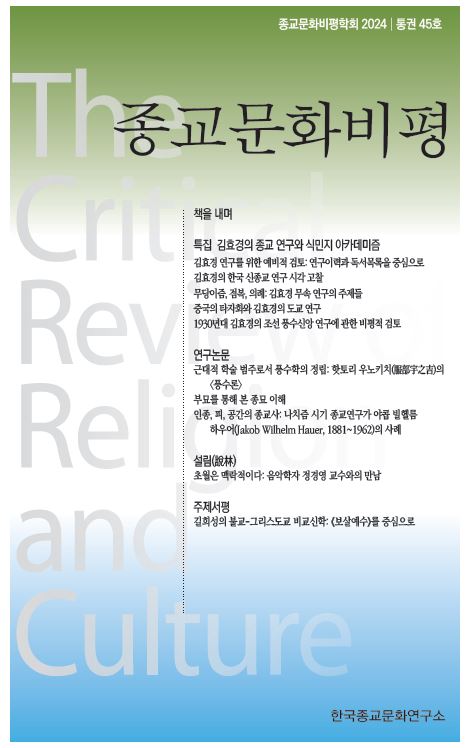 먼저 본지의 특집에 관하여 간단히 경과 말씀을 올리겠다. 이번 호의 특집 주제는 「김효경의 종교연구와 식민지 아카데미즘」이다. 지난 2023년 11월 18일 한국학중앙연구원에서 열린 정기 심포지엄의 제목이기도 하다. 이 학술대회가 처음에 기획된 것은 2017년 민속원이라는 출판사에서 간행된 《김효경 저작집》에서 기인한다. 엮은이 전경수 선생은 저작집 제1권에 실린 해제를 이런 말을 맺었다. “김효경은 기본적으로 종교학자로서의 자세를 균형 있게 갖추고 있음에 대해서도 중후하게 평가하지 않을 수 없다. (중략) 김효경의 업적은 인류학적인 관점에서뿐만 아니라 종교학적인 입장에서도 집중적으로 조명되기를 기대하는 바이다. 그럴 경우, 필자가 생각하지 못했던 김효경에 관한 또 다른 문제의식들도 더욱더 분명하게 드러날 수 있을 것이라고 생각한다.” 인류학자 전경수 선생이 애써 김효경의 저작들을 수집하여 영인본으로 내놓으며 한국의 종교학자들에게 분발을 촉구한 것이었다. 그러니 어찌 이에 화답하지 않을 수 있겠는가?