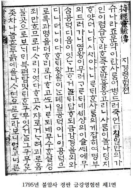 영험담 자체는 난해한 이야기가 아니다. 금강경이나 관음경을 지성으로 외우거나 관세음보살의 명호만이라도 부르면 이 세상에서 만나는 온갖 재앙을 피할 수 있으며, 죽어서 명부에 가더라도 큰 벌을 면한다는 내용이 대부분이다. 수록된 영험담은 전부 수나라, 당나라, 원나라, 명나라 등 중국을 배경으로 한 이야기들이다. 그러니까 중국 불교 문헌을 번역한 것이라 하겠다. 18세기 말 조선에서 판각한 문헌이라면 신라나, 고려, 조선을 배경으로 한 영험담도 들어 있지 않을까 생각했지만 그렇지 않았다. 이건 또 왜 그럴까?